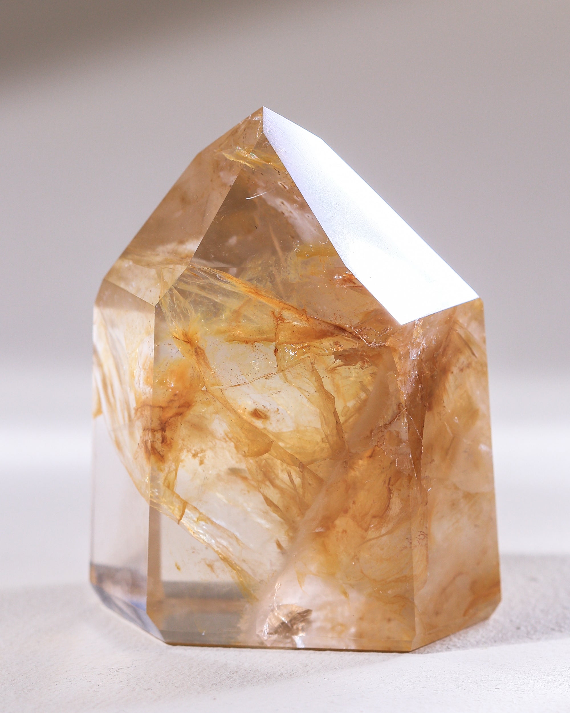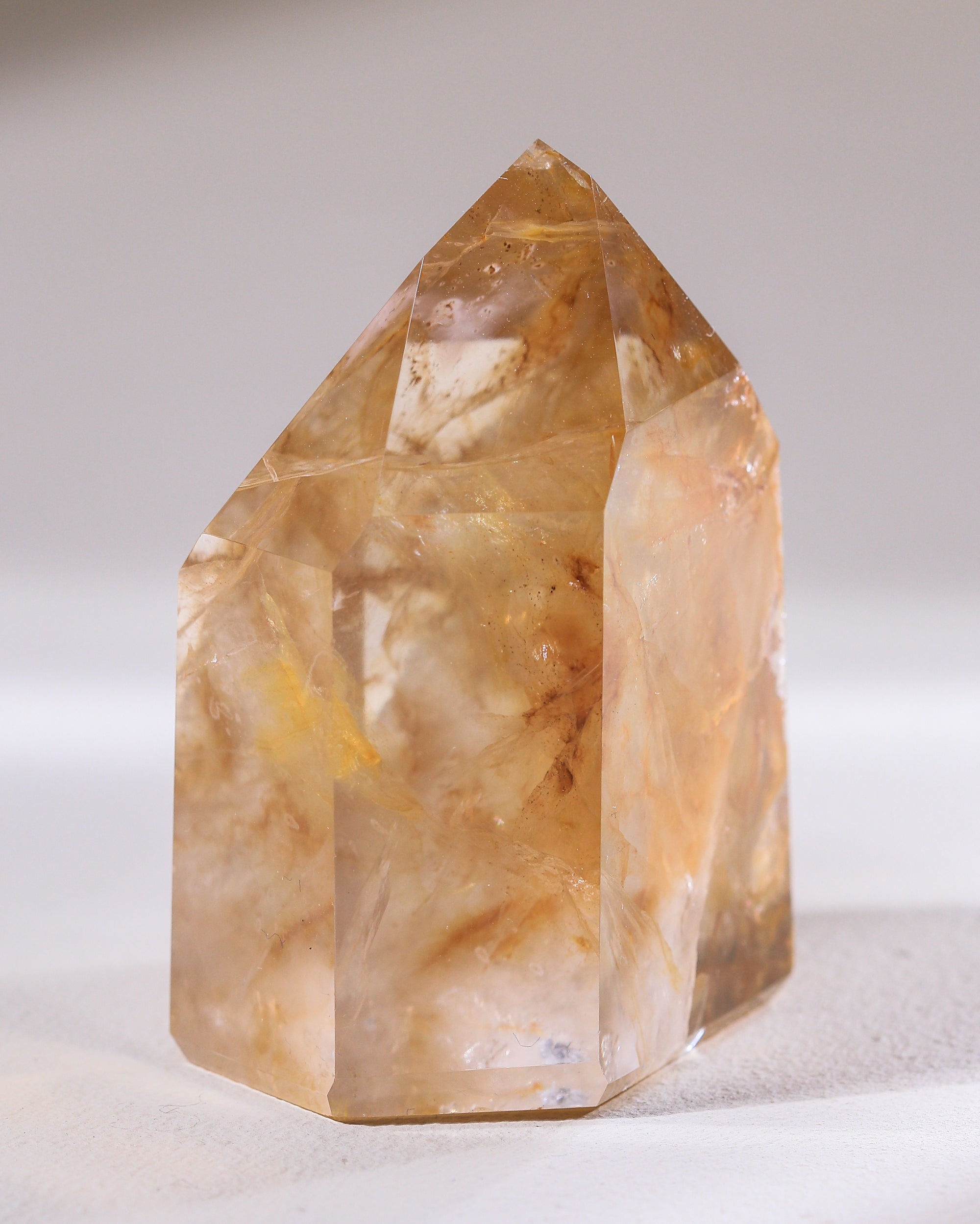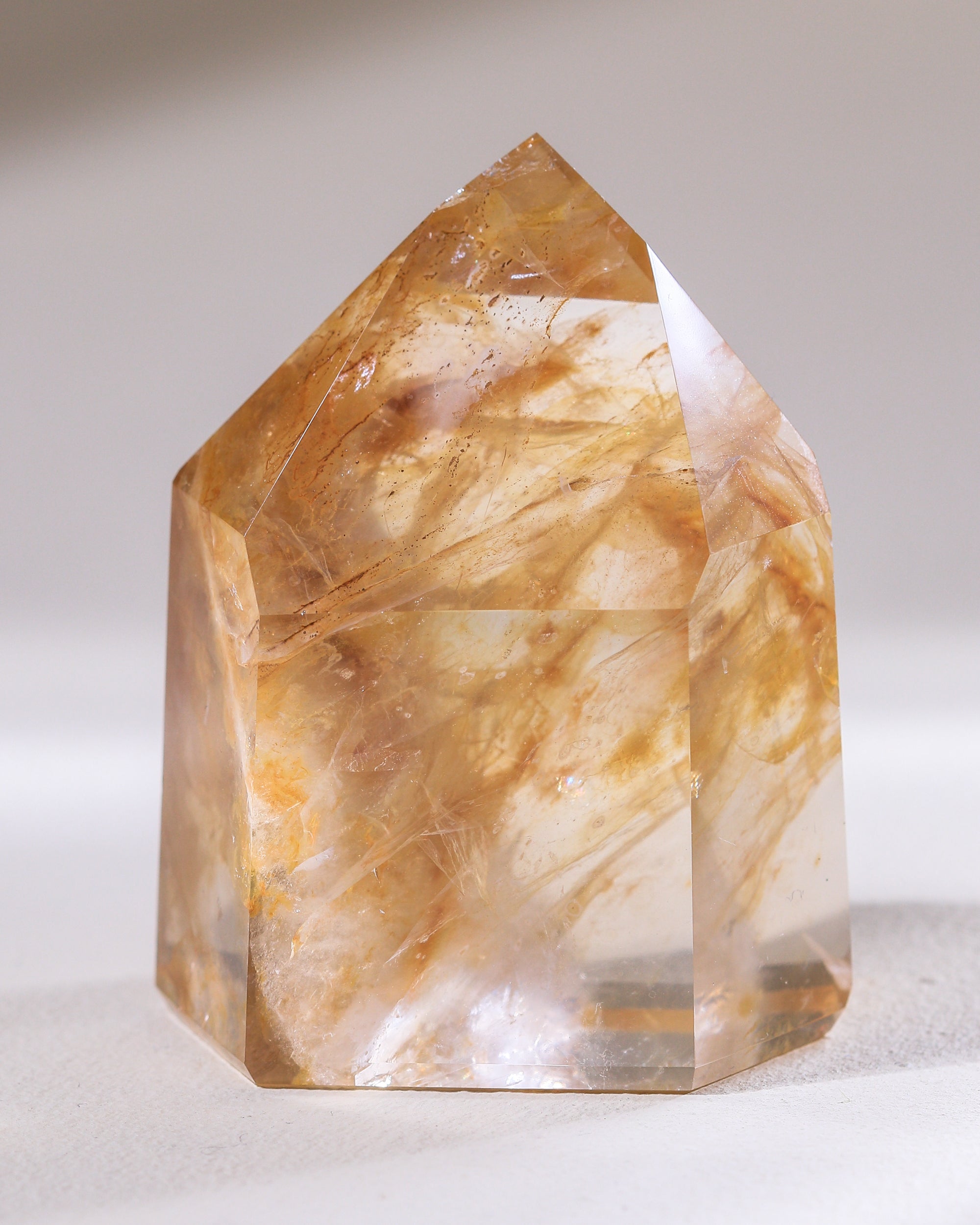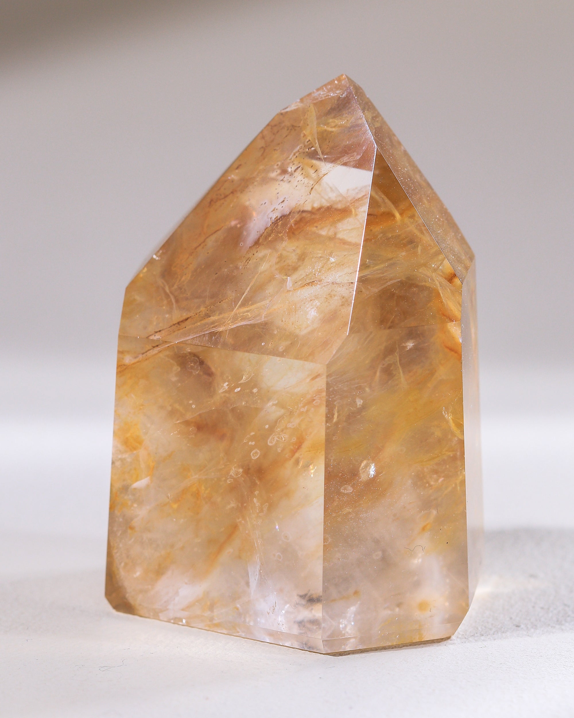 Obwohl wir immer fantastische Golden Healer aus Brasilien importieren, waren sie noch nie so schön wie diese: Glasklar, mit Einschlüssen, die Federstrichen gleichen. Mal ganz zart Goldgelb, mal tief Braungold. Diese Stücke sind in Bildern kaum einzufangen, so sehr schillern und glänzen sie.